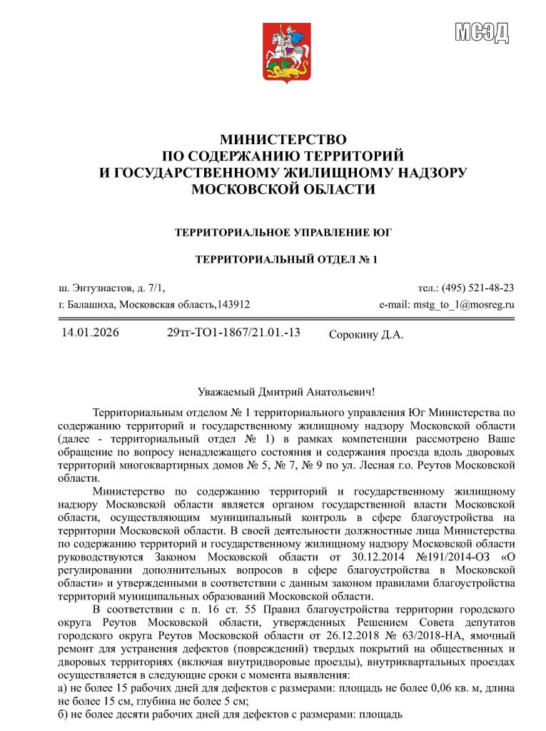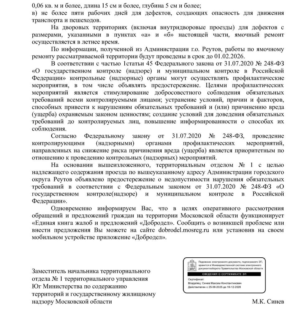 Для пресечения бездействия Администрации г. Реутов, была направлена соответствующая жалоба в Министерство по содержанию территорий и государственному жилищному надзору Московской области, по результатам рассмотрения которой Администрации г. Реутов объявлено предостережение с требованием устранения нарушений, которые Администрация г. Реутов обязалась устранить до 01 февраля 2026 года.